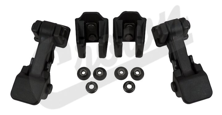 - Jeep Wrangler (JK) (2007-2018); Hood Catch Kit For 2 Sides; Includes 2 Hood Catches and 2 Brackets.